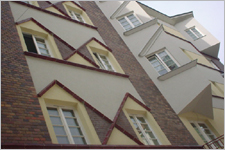 Die verschränkt eingesetzten Erker an der Gebäudeecke sind ein weiteres Kuriosum und verleihen dem Bau ein etwas "verzerrtes Gesicht" (H. Weihsmann). Die Sockelzone ist mit Klinker verkleidet, der Eingangsbereich auch mit roten keramischen Platten. Insgesamt eine ungewöhnliche und mutige architektonische Ansage im grauen Einerlei.