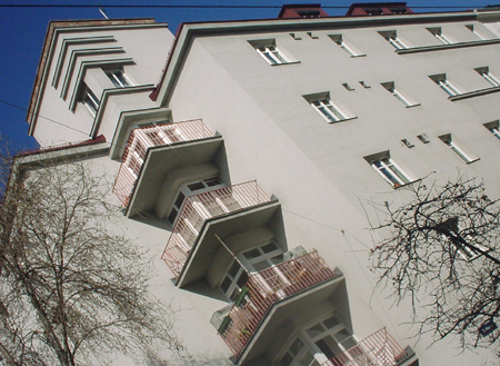 Wenn wir nun um den Märzpark herum, links in die Sorbaitgasse gehen, gelangen wir nach wenigen Schritten an der Ecke zur Geyschlägergasse (Nr. 2-12) zu einem weiteren interessanten Gemeindebau. Die in den Jahren 1928/29 nach Plänen von Max Fellerer errichtete Wohnhausanlage ist mit ihren langen Balkon- gruppen und Eckloggien ganz der "Neuen Sachlichkeit" verpflichtet und wirkt gerade deshalb immer noch zeitgemäß.